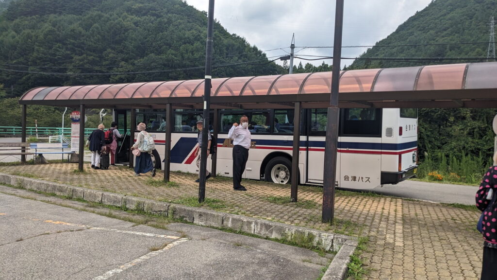 階段を降りると会津バスが停まってました。