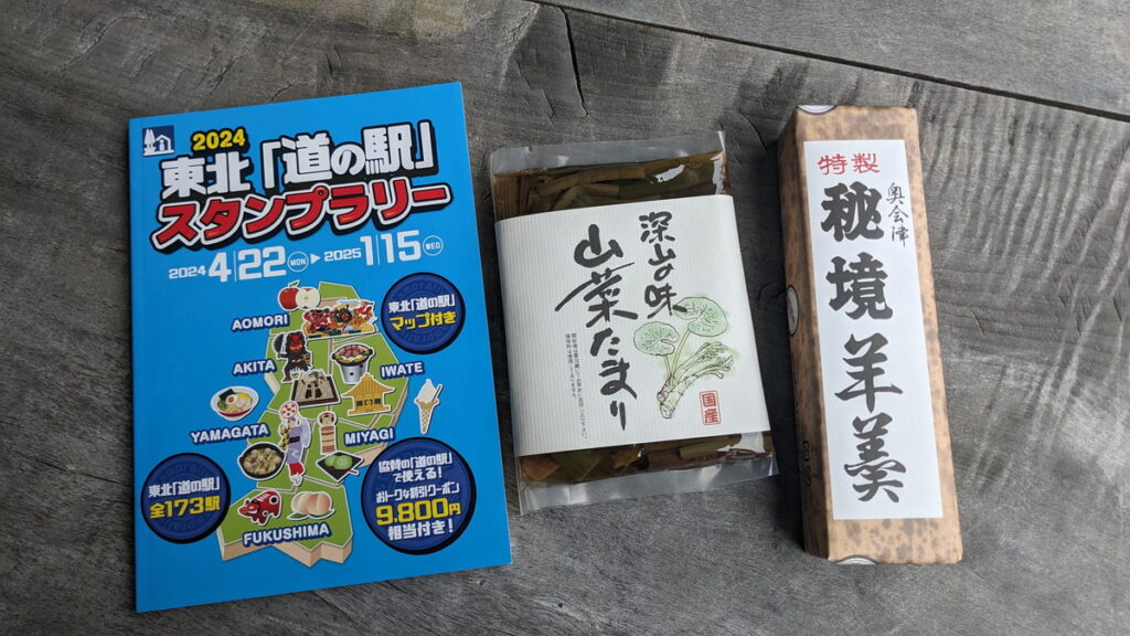 在庫確保しておいたスタンプブックと、奥会津産の漬物に羊羹を売店で購入。