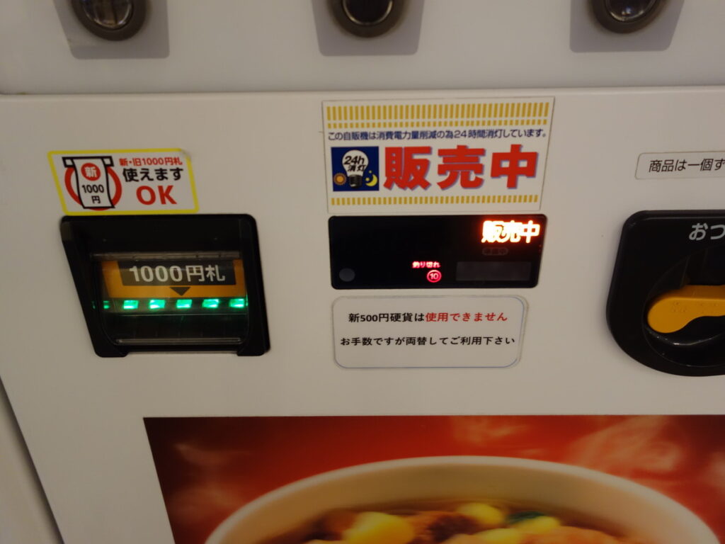 お昼になったのでカップ麺を買おうと自販機にやってきましたが10円釣銭切れ。