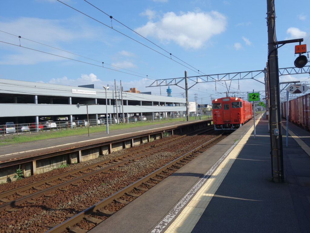 主要駅の上磯駅。住宅地はこの辺りまでで、函館方面から来た半数近くの列車が折り返しとなります。