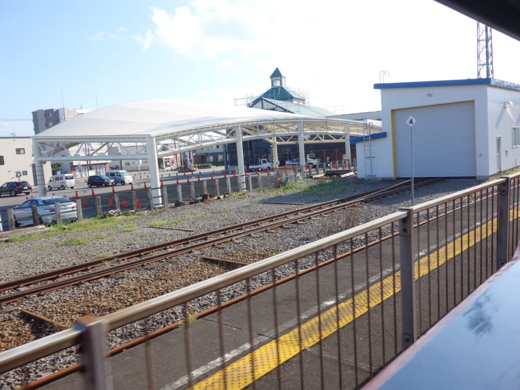 五稜郭からだいたい1時間で終点の木古内へ到着。左に見えているデカい建物は新幹線のホームです。
