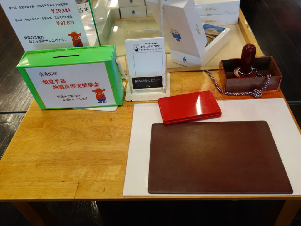 スタンプの話がまだでした。観光案内所が施設内にありその近くに設置されています。