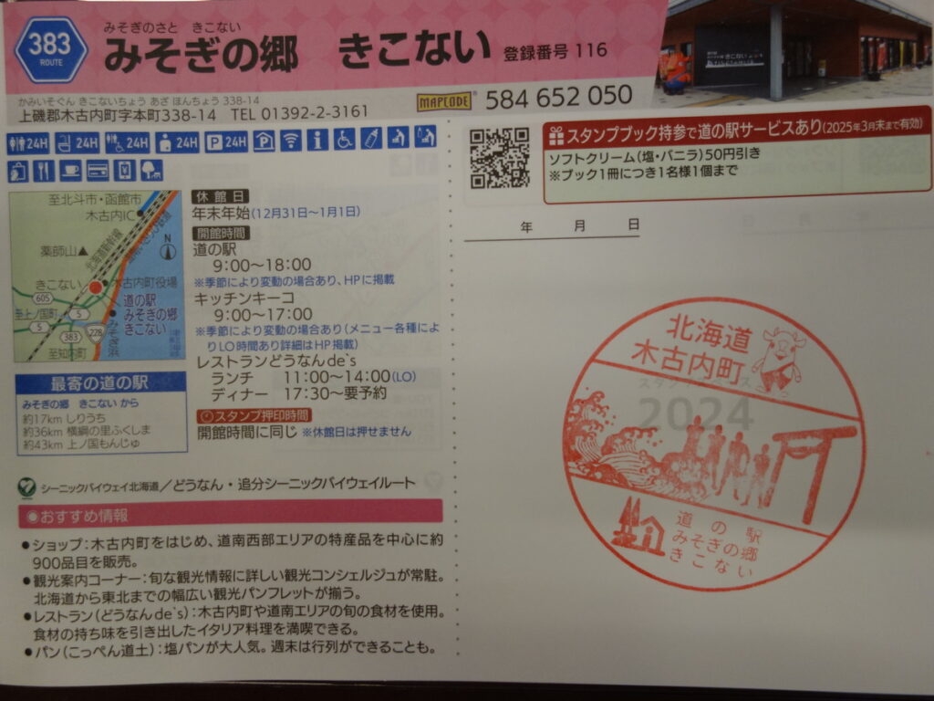HP | 道の駅公式:https://www.michi-no-eki.jp/stations/views/19840 北の道の駅:https://hokkaido-michinoeki.jp/michinoeki/3158/ みそぎの郷きこないHP:https://kikonai.jp/ |