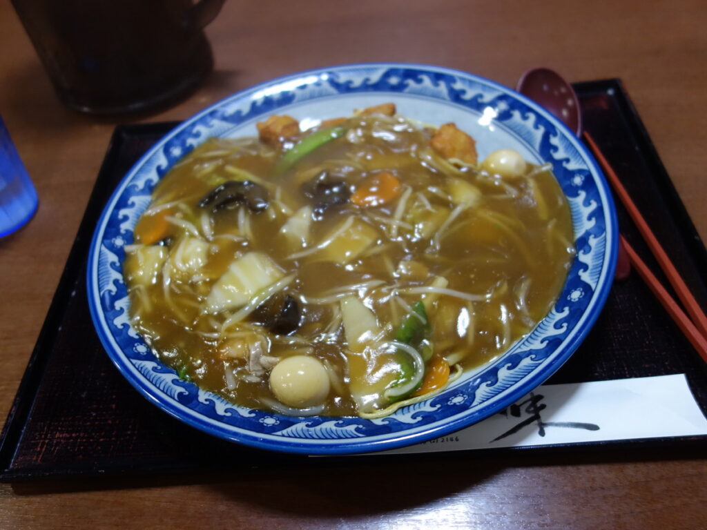 デカ盛りが出てきがちなあんかけ焼きそば。他の料理より一回り大きな皿で出てくる印象です。
