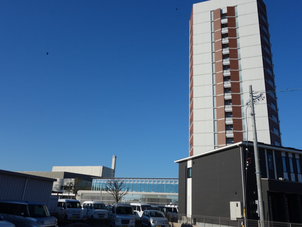 住宅地の中でひときわ目立つ15階建ての鈴鹿市役所。