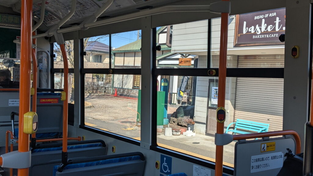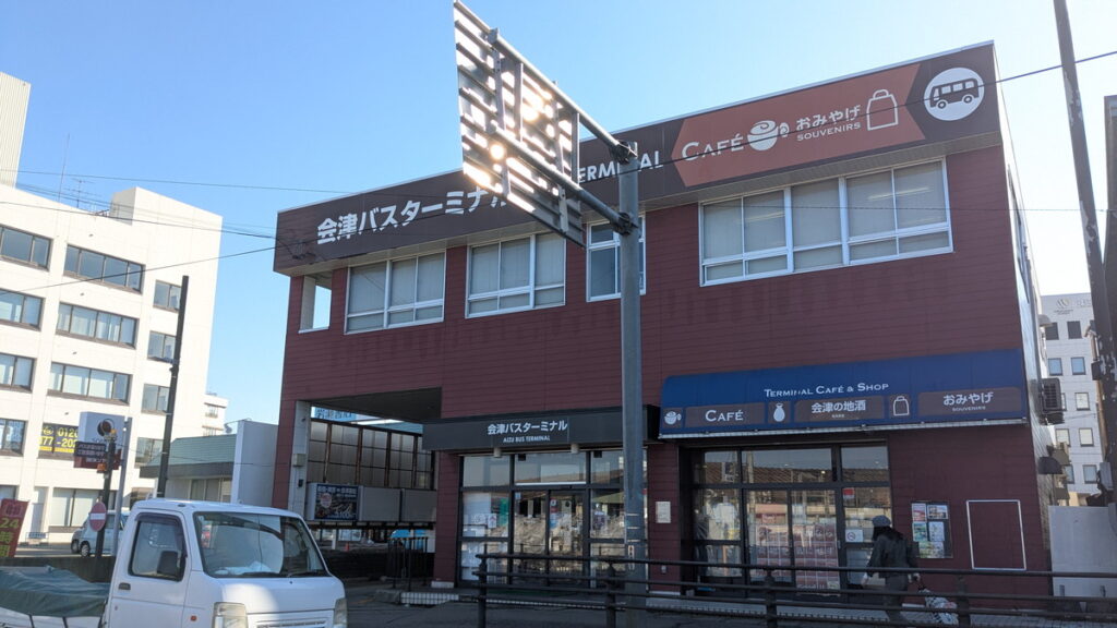 大型車両で運行する会津バスは敷地が足りないのでちょっと離れた場所に停留所があります。