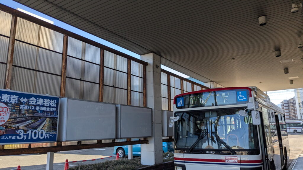 バスターミナルに移動。これから乗る会津若松行は予約不要の先着順なんですが