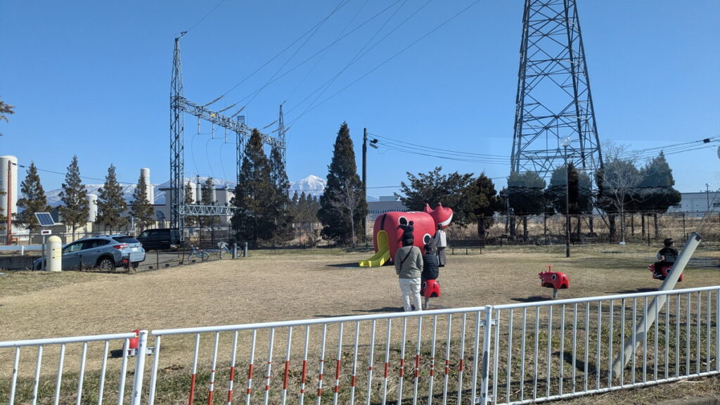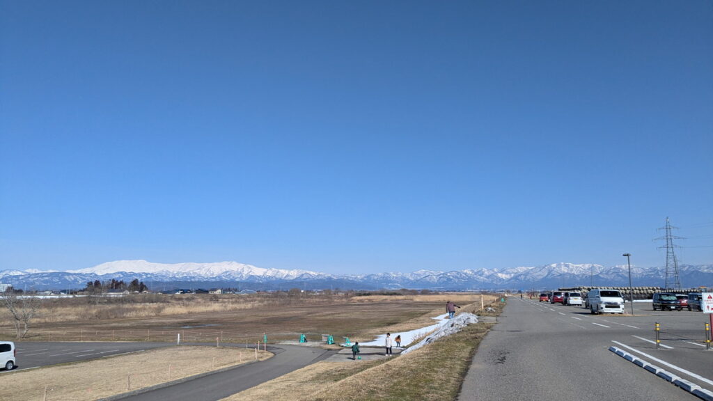 裏手に出ると阿賀川の河川敷と飯豊山とかそっちの方面の山が広がっています。