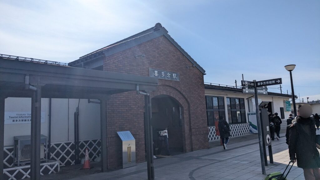 14時4分、喜多方で下車。レンガ造りの蔵をイメージした駅舎です。