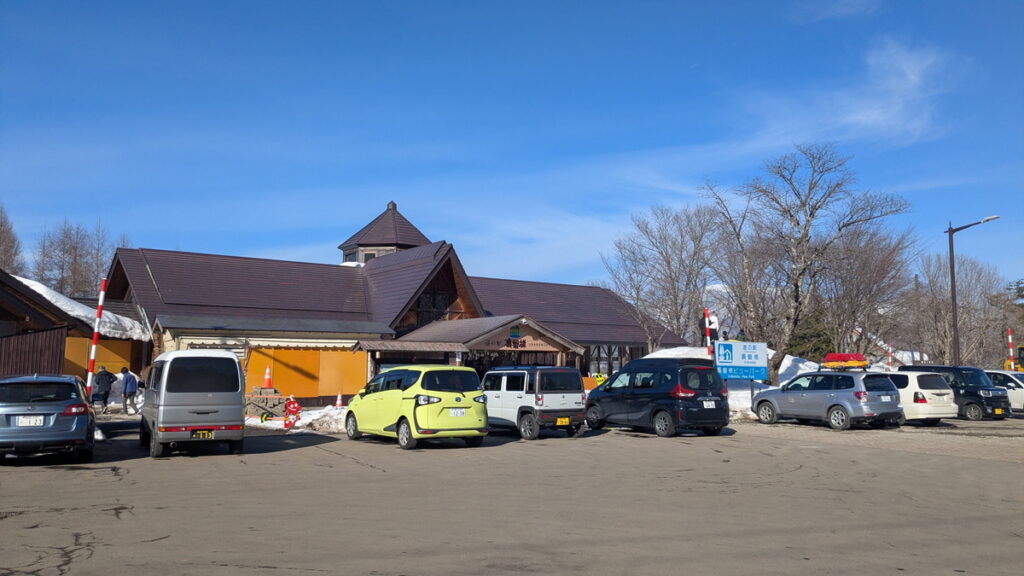 こちらが道の駅裏磐梯。やはり積みあがって固まった雪がなかなか溶けないのであって