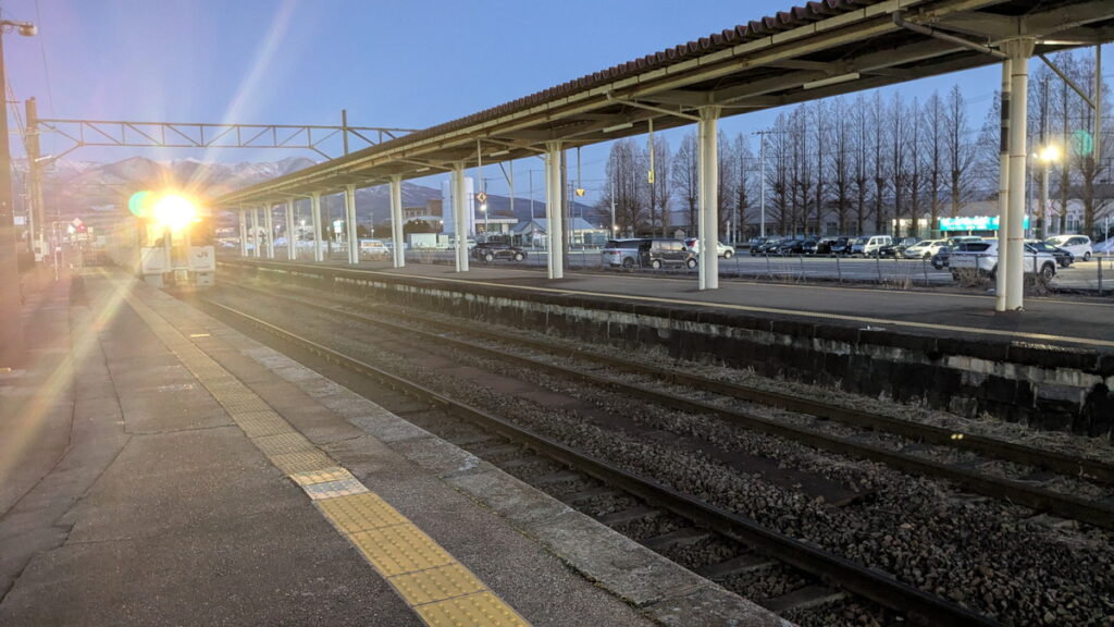 ほぼ定刻で会津若松駅に到着。天気のいい日が続いているからか積雪はゼロです。