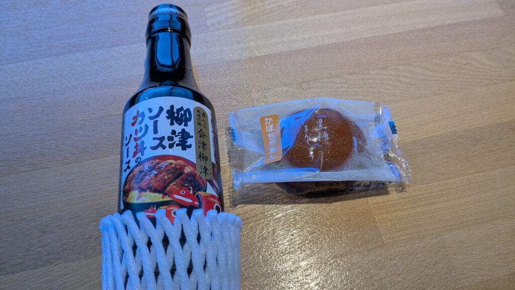 買ったのは会津名物、ソースカツ丼のソースとつまみ食い用のお菓子。